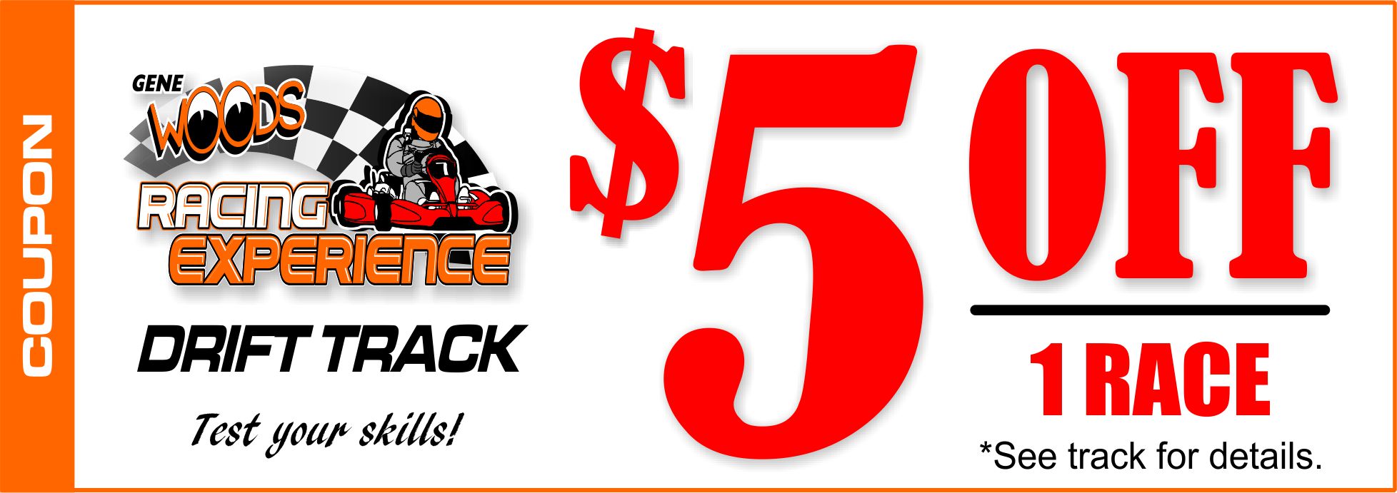 Opened in 2019, Gene Woods wanted to provide a unique and exciting way for the public to participate in the exciting "Drift Racing" experience. The purpose build drift track is different than any other Go Kart Track. Drift the corners and race from green flag to checkered flag with 15 heart pounding laps. Winner is presented with a trophy at the end. Family fun like no other.
